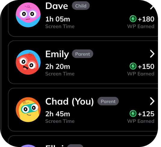 Streaks, WP, levels, and rewards that turn healthier screen habits into something your family actually wants to build.